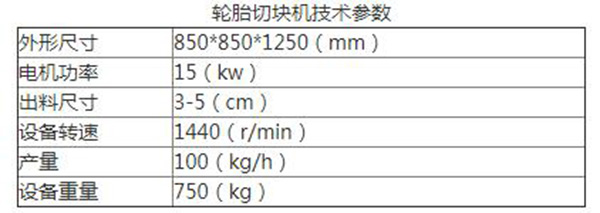 【輪胎切塊機產(chǎn)品介紹】 輪胎切塊機是輪胎粉碎機生產(chǎn)線中的第三道設備,將切成條后的輪胎切割成3-5cm的小塊,從而便于粉碎機粉碎。 【輪胎切塊機技術參數(shù)】
